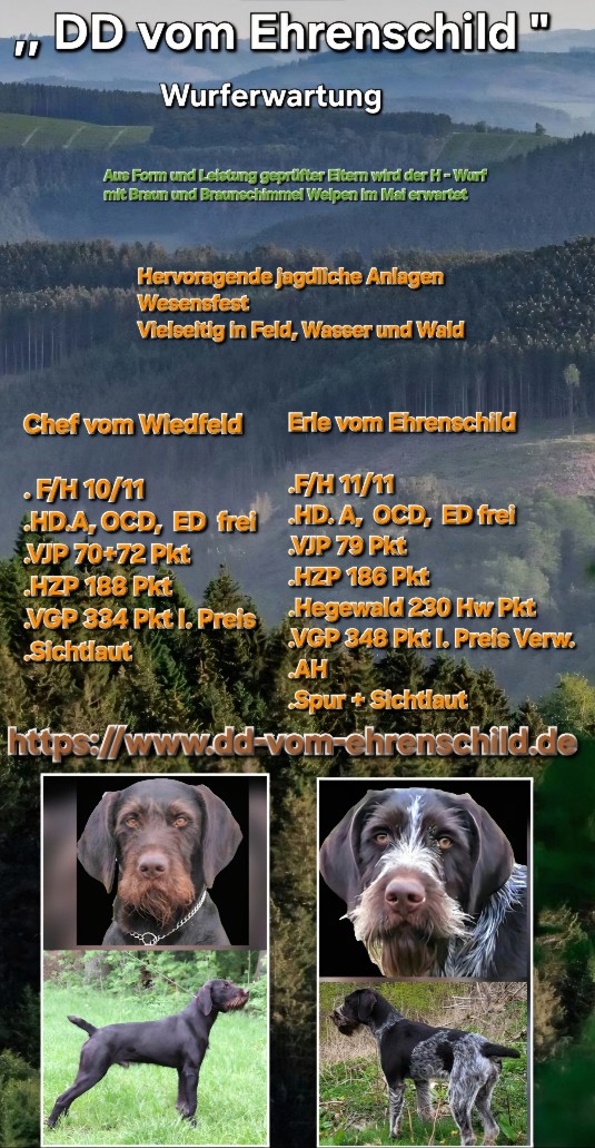 Wir weisen darauf hin, dass Welpen nur an Welpenkäufer abgegeben werden, die im Besitz eines gültigen Jagdscheins sind und über die entsprechenden jagdlichen Einsatzmöglichkeiten verfügen!