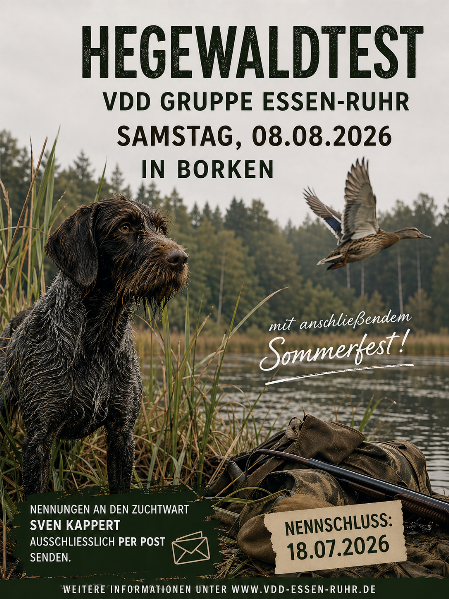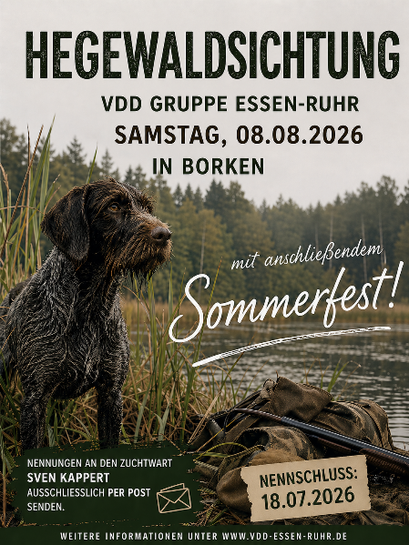 Die VDD Gruppe Essen-Ruhr bietet am Samstag, den 18.07.2026 einen Übungstag im Saugatter Mahlpfuhl an. Die Teilnehmerzahl ist begrenzt! Anmeldung und weitere Informationen unter: franz.kremer@kremer-entsorgung.de